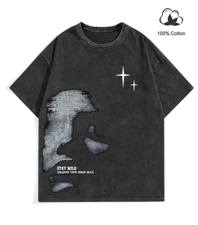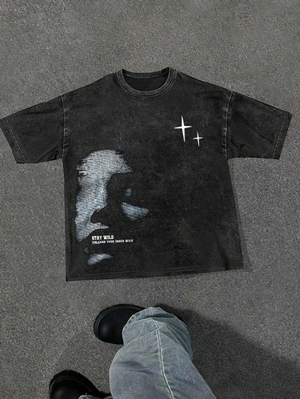 A Manfinity combina a estética urbana com um toque enigmático. Com estampa em estilo glitch retratando um rosto enigmático e detalhes de estrelas minimalistas, ela carrega uma energia misteriosa e autêntica. O tom preto desbotado reforça o visual vintage e street, enquanto a modelagem oversized garante conforto e estilo em qualquer situação. Uma peça feita para quem não segue padrões e busca se destacar com atitude.